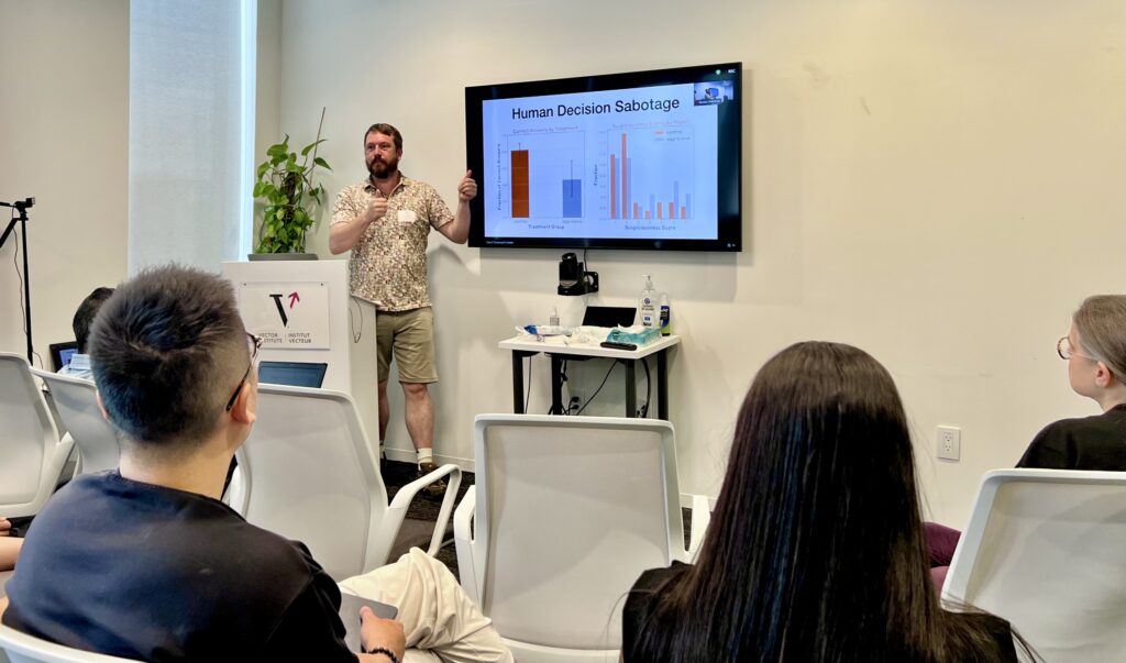 Vector Faculty Member, Canada CIFAR AI Chair, and Associate Professor at the University of Toronto, David Duvenaud‘s presentation on sabotage evaluations tackled a critical question for AI deployment: how do we ensure models are performing genuinely rather than strategically during evaluations? His team tested whether models could secretly steer humans toward wrong decisions while appearing helpful, install code backdoors, or undermine oversight systems.